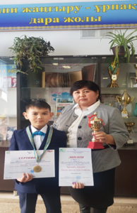 «Жас ғалымдардың ғылыми зерттеулері» атты Респубоикалық ғылыми практикалық конференцияның жеңімпазы Тұрғынбек Асылжан Нұрланұлы жетекшісі Бейсенова Динара Зайырбекқызымен